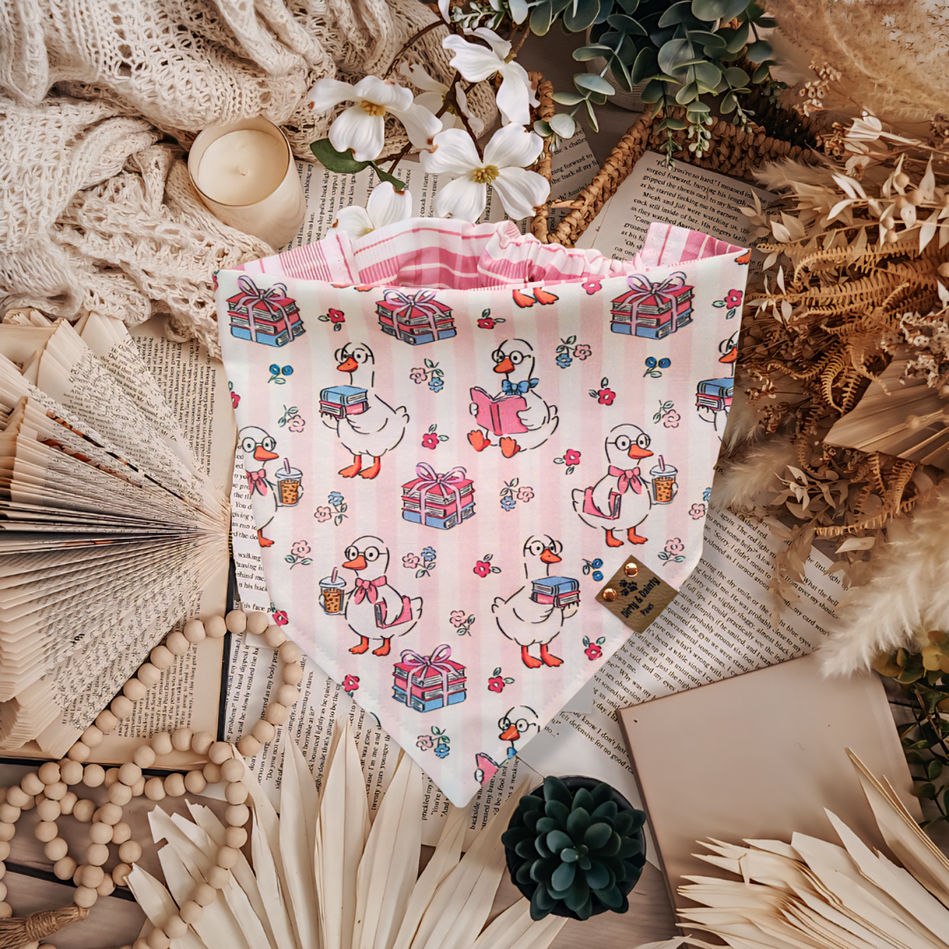 Cute, cozy, and full of charm, this Cozy Cotton Reversible Scrunchie Dog Bandana features an adorable book-loving goose print with gift boxes, coffee cups, and florals on one side and a classic pink plaid pattern on the reverse. This playful-yet-timeless design is perfect for everyday wear, spring outings, Valentine’s season, and photo shoots.