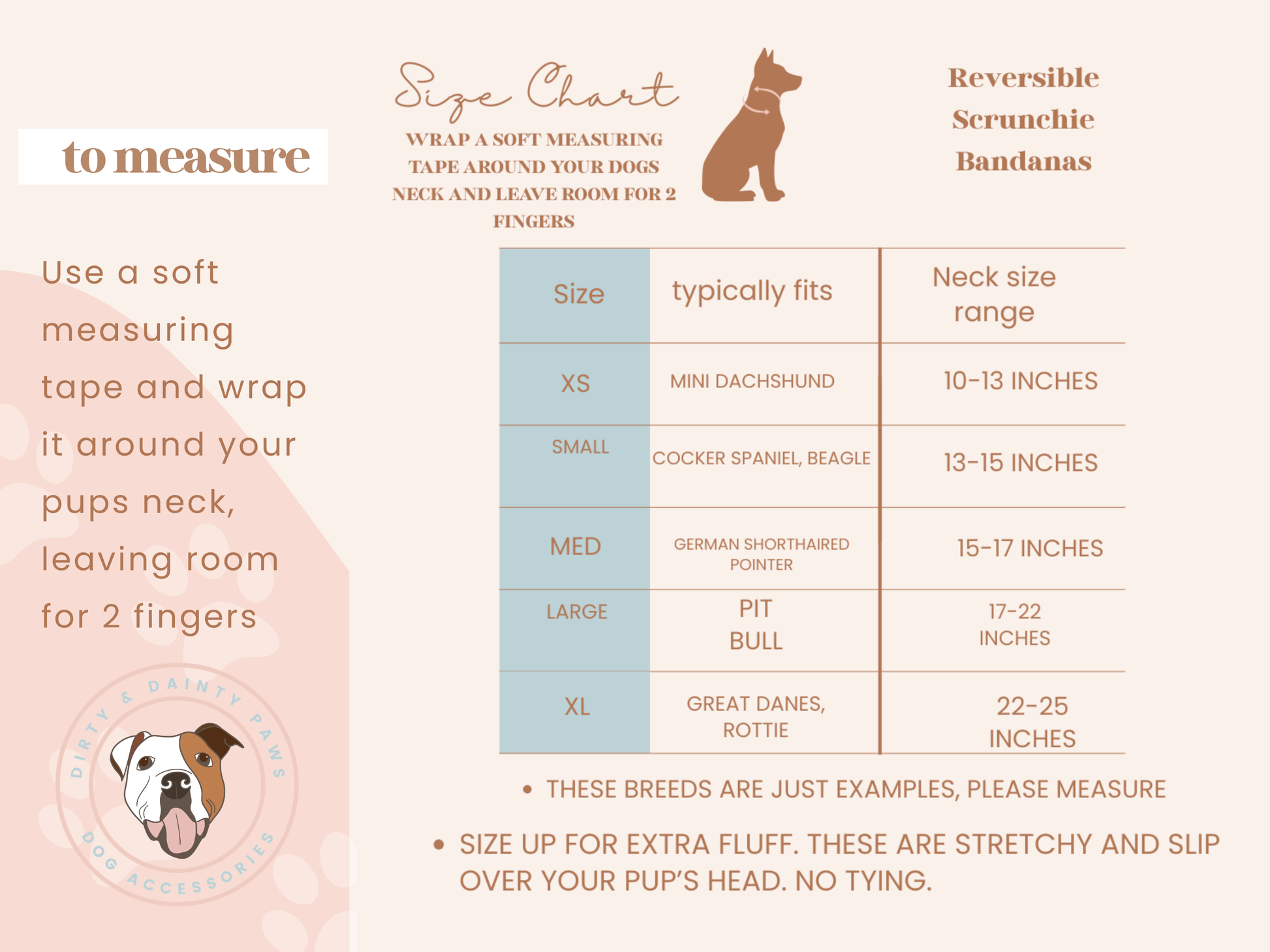 Dirty & Dainty Paws bandanas are designed in a scrunchie slip-on style, meaning they comfortably slide over your dog’s head instead of attaching to a collar.