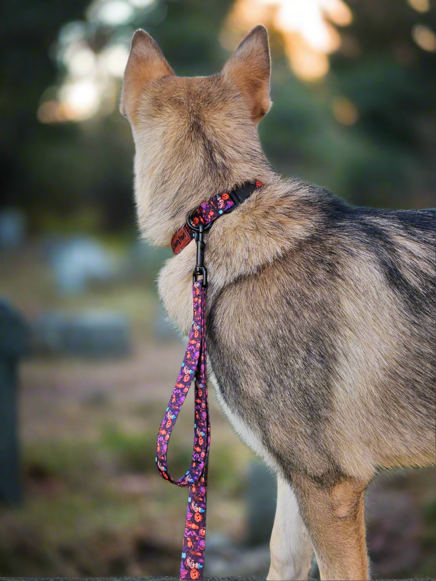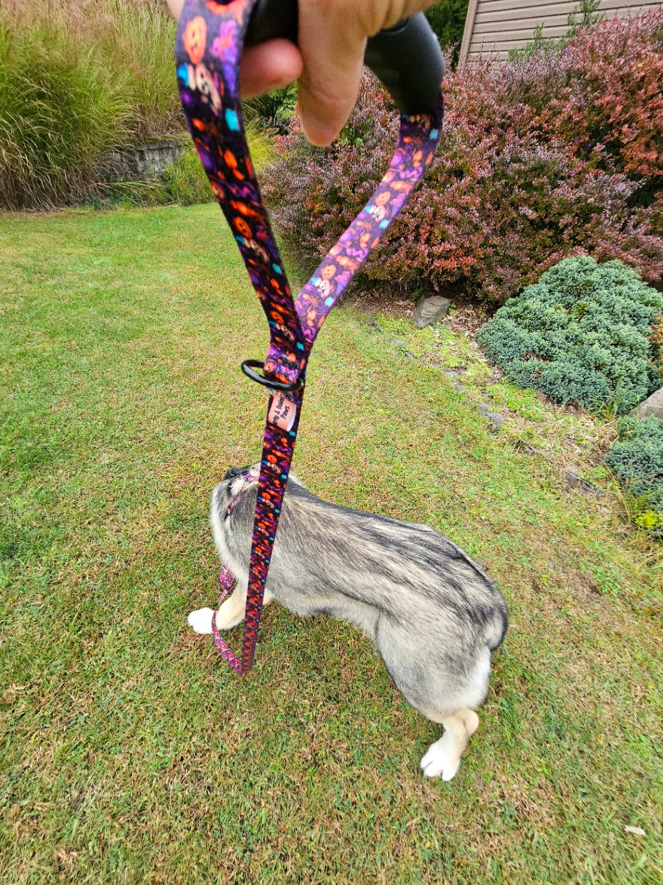 This leash is spooktacularly special! Made in the USA, it'll give you a comfy grip so your hand won't tire, and a traffic handle for better control of your pup in high-risk or busy areas. Crafted with 1" picture-perfect polyester, it can handle a working load of 1250lbs and break at 3800lbs, and last but not least an additional O ring to attach a poop bag holder or poop loop. Six feet of spine-tingly strength!